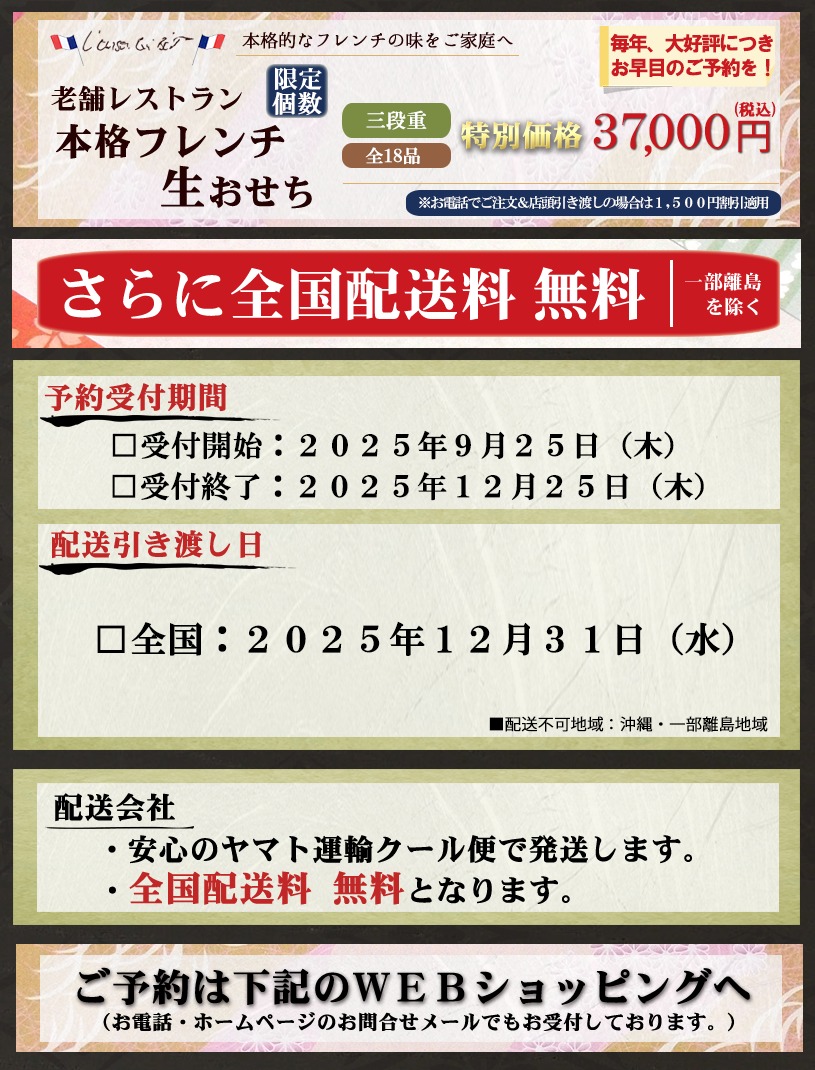 フランス厳選食材、伝統料理をお重に盛り込みました。お正月にお店の常連様にだけ、お作りしました。御好評をいただき、販売数限定で全国販売開始!